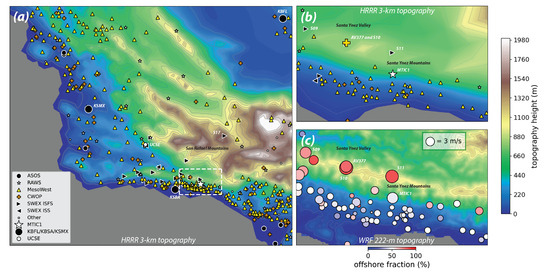 Wind observations for the ≈400 stations shown in Figure 2a came from three sources: the Meteorological Assimilation Data Ingest System (MADIS), the National Centers for Environmental Information (NCEI), and the SWEX field program page maintained by NCAR’s Earth Observing Laboratory. The MADIS observations represented these networks: ASOS (automated surface observing system) and AWOSs (automated weather observing stations), primarily located at airports, including KSBA Santa Barbara, KSMX Santa Maria, and KBFL Bakersfield; RAWSs (remote automated weather stations), sited mainly on mountain slopes; and CWOP (Citizen Weather Observer Program), contributed by private citizens and corporations. The MADIS stations labeled “MesoWest” [33] were dominated by public utility installations placed by Southern California Edison and Pacific Gas and Electric. Observations from the MARITIME network, mainly buoys, were removed. The ASOS data from MADIS were replaced with one-minute observations retrieved from the NCEI archive. We also have 21 ISFS (Integrated Surface Flux System) and ISS (Integrated Sounding System) sites that were erected for the SWEX program. The observations were examined for obviously bad and flagged readings. When possible, observations from the top of the hour were used, otherwise, the record closest to that time was chosen.