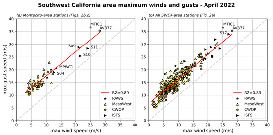 The zone also had 5 special SWEX (ISFS and ISS) installations, which reported winds every 1 s (Figure 2b,c). Among those, the fastest 5-min average wind speed (24.1 m ) was at ISFS site S11, located on the ridge directly north of MTIC1, and the fastest 3-s gust (28.8 m ) was recorded at S09, another ridge-top installation. ISFS station S10, located about 1 km west of AV377, reported a 3-s gust maximum of 25.4 m for the month. The scatter plot of monthly maximum sustained winds vs. largest gusts for the Montecito area (Figure 3a) emphasizes the fact that MTIC1 and AV377 were the only permanent sites that were particularly windy during the month. Indeed, as shown in Figure 3b, those two stations contributed the fastest legitimate wind and gust observations among the stations shown in Figure 2a, with only SWEX station S17, located well inland in the San Rafael Mountains (see Figure 2a), being comparable. The MTIC1 and AV377 readings appear to be of reasonable quality and this emphasizes their role in providing situational awareness regarding the wind threat in the Montecito area, particularly during Sundowner events.