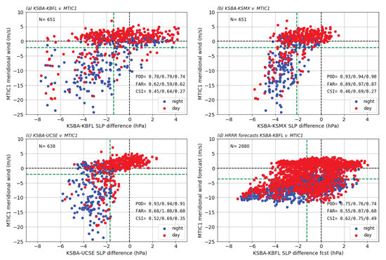In Figure 6, we consider the skill of using the SLP sign and magnitude in informing the strength of the meridional winds at MTIC1, motivated by [17] and related studies. Each available MTIC1 observation, taken 13 min before the hour, was matched with pressure differences computed at the top of the nearest hour, resulting in 651 comparisons with both KSBA-KBFL and KSBA-KSMX (Figure 6a,b). What is also shown is a comparison with SLP calculated between KSBA and Sedgwick Reserve (UCSE), a station operated by the University of California, Santa Barbara, and also identified in Figure 2a, which resulted in 638 successful matches. Each dot is colored red or blue for day and night hours, respectively, based on MTIC1 SW readings. Standard skill measures of the probability of detection (POD), false alarm rate (FAR), and the critical success index (CSI) [37] are also reported. For each, the slash-separated numbers represent values for all, night, and day hours. Accurately anticipating the sign of the MTIC1 meridional flow via contemporaneous SLP values is confirmed when the dots fall in the lower left (offshore) and upper right (onshore) quadrants. The upper left and lower right quadrants respectively represent false alarms and missed events.