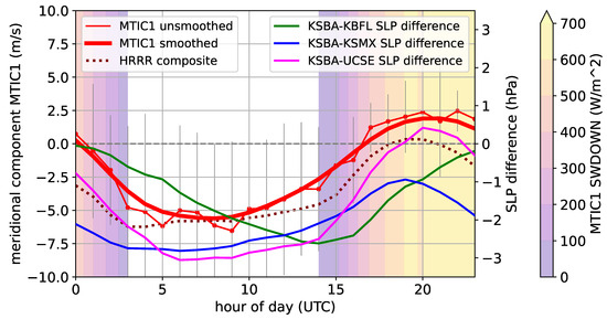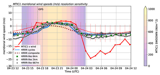 Figure 7 also reveals that the HRRR (maroon dotted line) successfully captured the diurnal variation of meridional winds at MTIC1 during April 2022 with a correlation of r = 0.93. This composite made use of a total of 60 simulations starting at 00 and 12 UTC for forecast hours 1 through 24, inclusive, even though for those cycles the HRRR was integrated for 48 h. HRRR 10-m V forecasts were interpolated to the station location and a neutral log wind profile employing the relevant grid box’s surface roughness was used to compensate for the station’s anemometer mounting height of 6.1 m AGL [6].