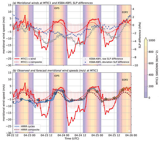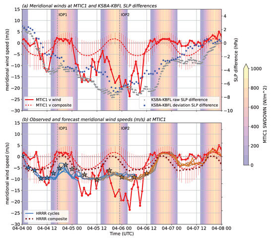 Time series for period including IOPs 1 and 2 showing MTIC1 meridional wind component (m ) in thick red, with diurnal composite MTIC1 meridional winds and standard deviations (thin red, from Figure 7). (a) Markers show raw and deviation KSBA-KBFL SLP differences (hPa). (b) HRRR forecasts in blue to orange lines, with each star, color fill, and line color representing a different cycle (the star being the cycle’s initialization time). HRRR meridional wind monthly composite (from Figure 7) is depicted as the maroon dotted line. Background color fill in both panels shows observed SW at MTIC1 (W ).