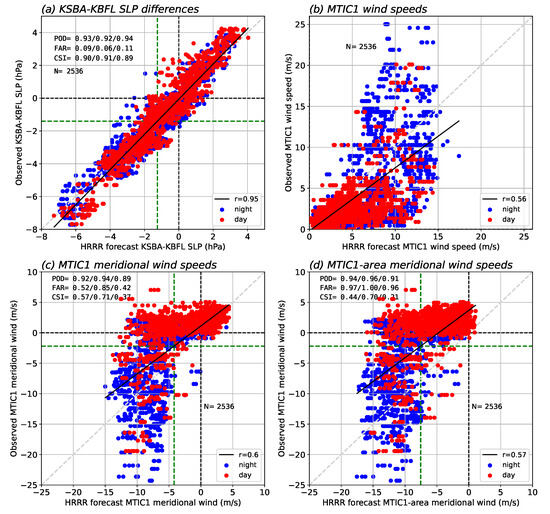 Figure 11a reveals that the HRRR was very skillful (r = 0.95) at anticipating the KSBA-KBFL raw SLP, both during day (red) and night (blue) hours. Regarding the sign of the SLP difference, the POD was 0.93 for all hours with a FAR of less than 10%. This skill did not extend to anticipating wind speeds at MTIC1 (Figure 11b), however. While there is a modest positive relationship overall, forecasts exceeding about 5 m demonstrate no useful association with observed wind speed. The HRRR predicted wind speeds in the range 7–14 m irrespective of the actual values, which varied over a much larger range. This is consistent with what was seen in Figure 9b and Figure 10b for IOPs 1,2, and 5.
