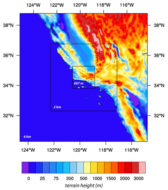 The HRRR forecasts for MTIC1 shown above do not exhibit much skill with respect to identifying periods of particularly strong winds at the Montecito RAWS (e.g., Figure 11). During IOP5 (Figure 10), for instance, the winds predicted for MTIC1 did not deviate much from the month-long composites, which included many non-windstorm hours. A possible explanation is the model’s 3 km grid spacing, which is coarse relative to the spatial scale of the SYM, but [15,18,23], in particular, have demonstrated that higher-resolution simulations can still have difficulty making accurate forecasts of Sundowner strength and structure. Nevertheless, in this section, we examine simulations of IOP5 conducted with a near-clone of the HRRR, made using its same WRF configuration. Our WRF simulations used version 4.2.2, employed physics options consistent with HRRR version 4, were focused on the U.S. West Coast, and featured domains with grid spacings of 6, 2, and 0.667 km (Figure 12). They were initialized with HRRR forecasts on native model levels from the 12 UTC 22 April 2022 cycle, and this cycle also provided the boundary conditions.