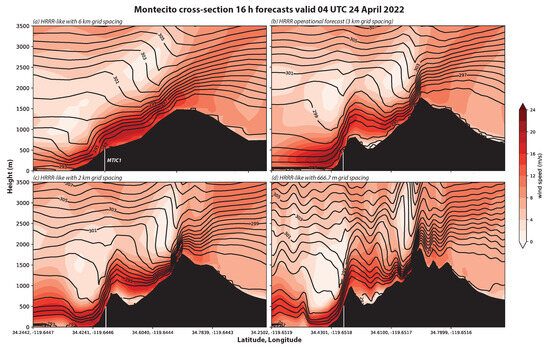 Figure 13 shows vertical cross-sections oriented south-north across MTIC1 representing the 16 h forecast valid 04 UTC on 24 April, during IOP5 and at the time of peak winds observed at MTIC1 (e.g., Figure 10). Panels (a), (c), and (d) represent clone runs while (b) is the operational HRRR forecast interpolated onto our 2 km domain. All four panels reveal a substantial downslope windstorm in progress, as evidenced by strong winds (colored field) and downward-sloping isentropes (black contours). When only the outermost (6 km) domain was active (Figure 13a), the terrain shape was quite smooth but downslope winds were still predicted across MTIC1. With progressively finer grid spacing, the SYV emerged and the south-facing slope of the SYM became steeper. The flow also started following the contour of the SYM more closely but did not become particularly faster.