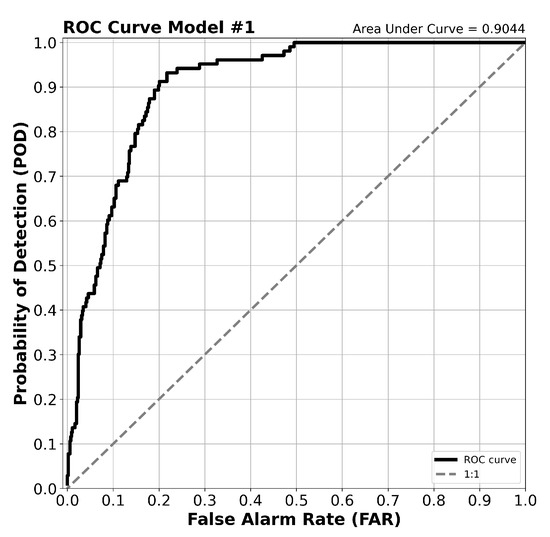 The predicted values of STRONG are probabilities ranging between 0 and 100%. At this point, a threshold probability is selected to assess POD, FAR, and other skill measures. There is no single choice for the optimal threshold, as it depends on one’s need for awareness (high POD) vs. tolerance for false alarms. We adopted the frequently employed Youden index [44], which tends to penalize missed events and false alarms. For Model no. 1, the Youden cutoff of ≈18% resulted in a POD of 0.93 and a FAR of 0.22. This model applies to all hours and is thus superior to the naive classification (Figure 6a) based solely on SLP difference and is more useful as it focuses on the most concerning offshore winds. The common “top left” criterion yielded very similar cutoffs (not shown); other metrics such as the Critical Success Index (or threat score), F1 score [45], and proportion correct, pointed to thresholds yielding lower values of both POD and FAR (not shown).
