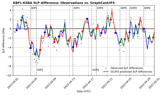 Time series of observed (gray markers) and GraphCast-predicted KSBA-KBFL SLP differences, at a temporal spacing of 6 h. GC forecasts commenced daily at 12 UTC with IFS analyses and were integrated for 60 h. Colored circles indicate each GC run’s first forecast. Vertical dash lines indicate official IOP and EOP start times.