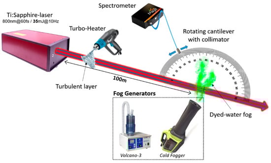 Experimental setup including Ti:sapphire fs laser, turbo-heater TESLA TH-2200 (temperature from 100 to 600 °C), liquid aerosol (fog) generators Volcano-3 or Cold Fogger SF-720, receiving optical equipment (optical collimator, fiber, Maya-2000Pro spectrometer).