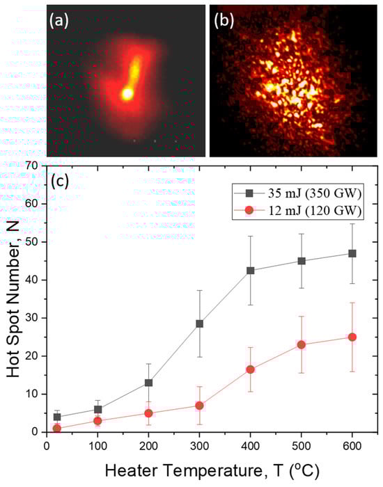 Recently [], our experimental studies on the influence of turbulence on laser beam filamentation showed that the application of a thin but intense turbulent layer in the optical path of high-power laser radiation propagation leads to intensity redistribution in the beam cross section due to the inhomogeneities of air refractive index, which initiates small-scale stochastic optical beam collapse and the formation of high-intensity hot spots (HSs) during the propagation. As an example, Figure 2a,b demonstrates the images of the transverse structure of a 35 mJ femtosecond laser beam traveling a 100 m air path (a) without a turbulent layer and (b) when a turbo-heater is switched on.