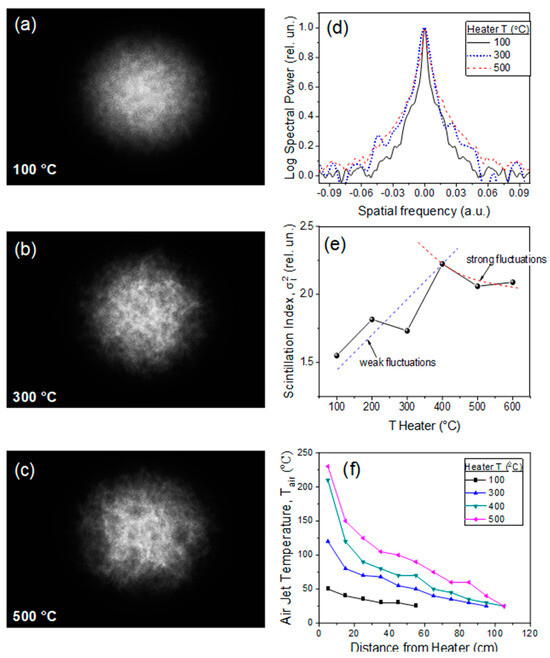 Figure 3d illustrates the power spectrum of the scintillation index measured in the central beam area. Obviously, a change in the heater temperature affects not only the temporal statistics of the laser beam intensity pulsations but also its spatial spectrum. In this figure, 1D intensity profiles (along the horizontal axis) are plotted after a test laser beam passes through a turbulent layer created at different heater temperatures. The intensity profiles shown in this figure are pre-processed using a digital spatial filter to cut off the high-frequency noise components. It is clear that the amplitude of low-frequency perturbances increases sharply along with the fan temperature.