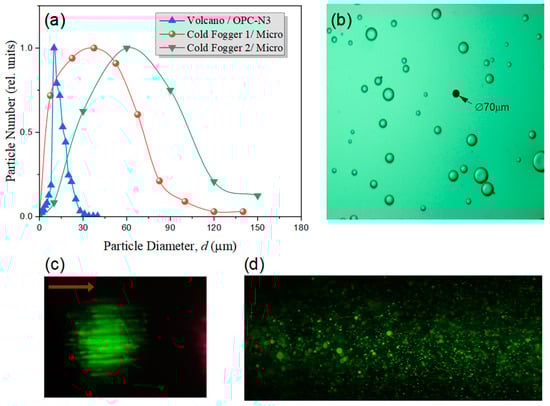 Another type of liquid aerosol used, a coarse aerosol with modal particle diameter d = 40 or 60 μm (see Figure 4a), is created by an atomizing aerosol generator (Cold Fogger SF-720) equipped with two nozzles, respectively. In this case, the particle concentration is approximately two orders lower than for the fine-dispersed aerosol. Importantly, both commercial aerosol generators produce a well spatially bounded and highly directed stream of cold-water particles. To measure the size distribution of particles, they are deposited on a transparent slide with an oil layer and processed using the software of the digital microscope “Mikmed-6 LOMO”. A magnified image of the deposited aerosol is exemplified in Figure 4b. The images in Figure 4c,d show fine- and coarse-dispersed aerosol luminescence in visible light excited by an IR femtosecond laser pulse spatially modulated by a turbulent layer.