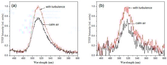 TPEF spectra of uranine-dyed water aerosol with/without turbulence modulation of femtosecond IR pulse for (a) fine and (b) coarse aerosol distribution (Cold Fogger 1&2 in Figure 4a).