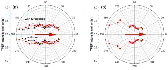 (a,b) TPEF angular distribution in dyed water aerosol with (a) fine and (b) coarse particle distribution stimulated by a femtosecond IR laser pulse passed through a thin turbulent layer. The data is averaged over 10 s. Red arrows show the direction of fs-laser incidence.