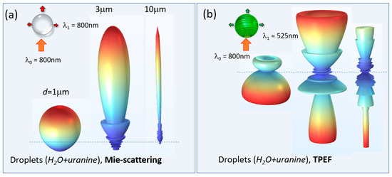 It is worth noting that the dimensionless Mie parameter (ρ = πd/λ) for the majority of particles in the distributions considered (Figure 4a) corresponds to the criterion of an optically large particle (ρ >> 1) at the wavelength of the incident radiation λ = 800 nm, which in the case of elastic optical scattering should lead to a sharp asymmetry of the scattered field with the predominance of forward Mie-scattering. Indeed, our theoretical simulation of Mie-scattering and nonlinear fluorescence of aqueous particles shown in Figure 7a,b clearly demonstrates fundamental differences in the angular distribution of elastic scattering and the nonlinear TPEF process in dyed water droplets [].