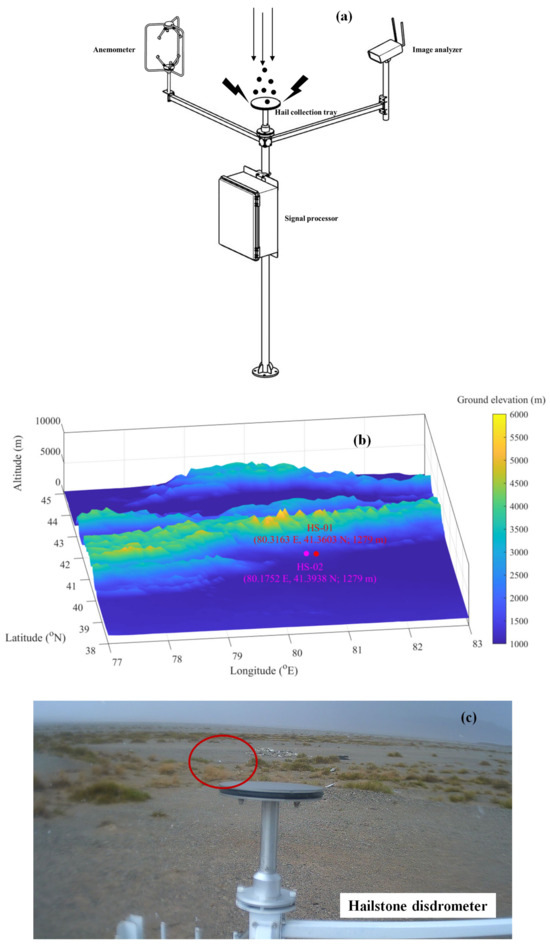 In 2023, two hailstone disdrometer stations (HS-01 and HS-02) with a distance of 12.35 km were established in Aksu, Xinjing (Figure 1b,c). Three hail events observed using these two instruments in summer were analyzed in this study. The surface meteorological conditions provided by four surface weather stations around the two hailstone disdrometers, i.e., the Y5948, Y5979, Y8703, and 51629 surface weather stations, which had distances of 0.01 (12.36) km, 3.98 (16.11) km, 4.47 (12.65) km, and 12.17 (14.02) km from the HS-01 (HS-02) hailstone disdrometer, respectively, were used to aid in the hail analysis. The Fengyun 4A satellite-based cloud-top brightness temperature [58] was employed to display the development of deep convection clouds during the hail process. The data have a horizontal resolution of approximately 4 km at 1 h intervals. Moreover, the synoptic context of the hail event is shown by an hourly fifth-generation global climate reanalysis dataset produced by the European Centre for Medium-Range Weather Forecasts (the ECMWF ERA5 dataset), with a horizontal grid spacing of 0.25° × 0.25° and 37 vertical levels [59].