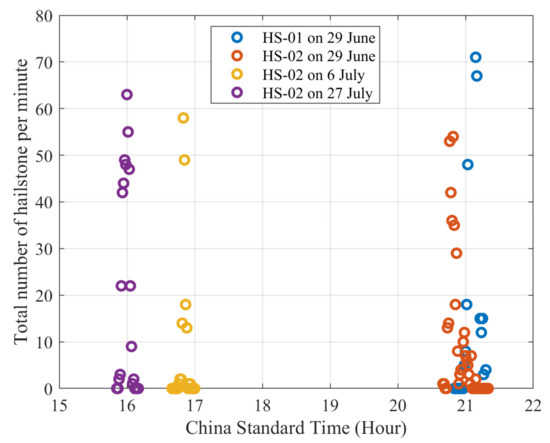 The hailfall process on 29 June was observed simultaneously using two hailstone disdrometers (HS-01: blue; HS-02: brown), and the hailfall process was observed using the HS-02 hailstone disdrometer on 6 July (yellow) and 27 July (purple).