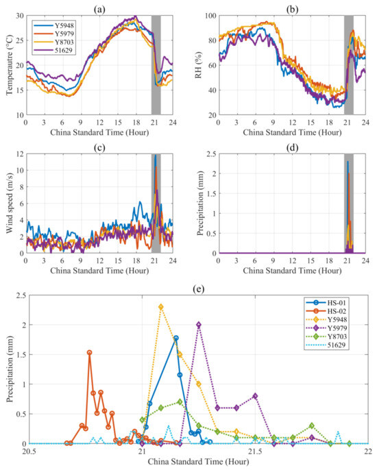 Diurnal evolution of temperature (a), relative humidity (b), wind speed (c), and precipitation (d) on 29 June observed at four surface weather stations (Y5948: blue; Y5979: red; Y8703: yellow; and 51629: purple) around the hailstone disdrometers; the gray area denotes the periods with hail detected by the hailstone disdrometer. (e) Equivalent liquid precipitation derived from the two hailstone disdrometers (HS-01: solid blue; HS-02: solid brown) and observed using the automatic rain gauge at four surface weather stations (Y5948: dashed yellow; Y5979: dashed purple; Y8703: dashed green; and 51629: dashed blue).