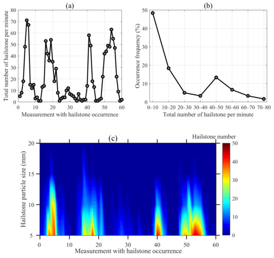 Figure 4 shows the statistics for the number and particle size of hailstones from the three hailfall events in Aksu, Xinjiang, in the summer of 2023. The maximum number of hailstones was ~70 per minute (Figure 4a), with an average hail number and a standard deviation of 20.1 ± 21.0 per minute. The probabilistic statistical analysis showed that the hail number was mostly <10 per minute (Figure 4b), with an occurrence frequency of 48%. In addition, 13% of the hail numbers exhibited a secondary occurrence peak at 40–50 per minute. The main data characteristics of hail observations are summarized in Table 2. Although the hail particle size exhibited certain variations among the different observational samples, the hail particle size was generally <20 mm and was primarily distributed between 5 and 10 mm for the hail samples (Figure 4c), which was generally consistent with the results of Zhang et al. [60] based on hail data from surface stations in China for the period of 1980–2015. Zhang et al. [60] also indicated that severe hail (with a maximum hail diameter ≥20 mm; 5.32% of all cases) mainly occurred along the edge of the plain near mountainsides and was most likely to develop in the afternoon.