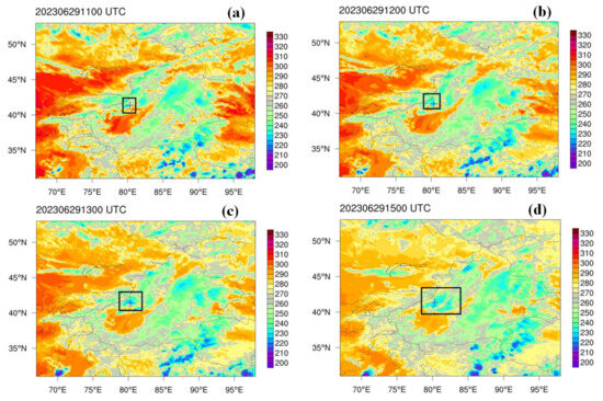 Distribution of the Fengyun 4A satellite-based TBB (unit K) at 11 UTC (a), 12 UTC (b), 13 UTC (c), and 15 UTC (d) on 29 June 2023. The black crosses mark the HS-01 hailstone disdrometer, and the black rectangles denote the development of deep convective clouds.