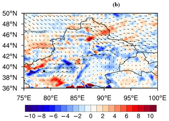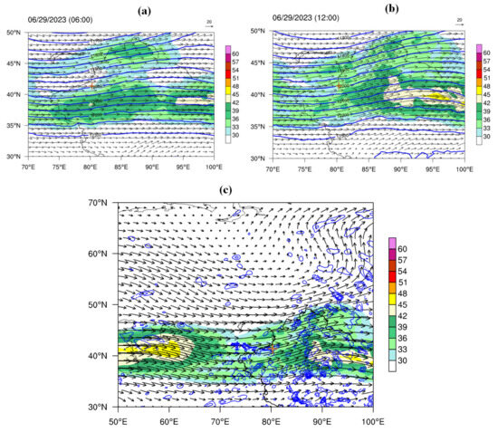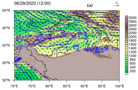 Figure 6 shows the 200 hPa weather conditions derived from the ECMWF ERA5 dataset on 29 June 2023, which indicate an east—west-oriented high-altitude jet during convective cloud development. At 06 UTC (Figure 6a), there were multiple jet cores in Xinjiang and its surrounding areas, with the highest wind speed reaching ~42 m/s between 35 and 40° N over western Xinjiang. In addition, there was also a weak jet near 45° N. The convective clouds developed between the two jets and were located on the left side of the entrance area of the southerly jet. At 12 UTC (Figure 6b), the westerly jet moved eastward and strengthened. A significant high-level divergence area (blue contour line in Figure 6c) appeared near the hailfall regions, which was conducive to the development of upward motion. Figure 7 shows the 500 hPa weather situation on 29 June 2023, and there was a cutoff vortex near 60° N in the high-latitude region. Xinjiang was under the influence of the westerly flow at the bottom of the vortex. A shortwave trough appeared over the Tarim Basin in southern Xinjiang, and the hailfall areas were under the control of northwest airflow. At 700 hPa, a vortex system was distributed along the terrain on the southern slope of the Tianshan Mountains (Figure 8a). Under its influence, a westward jet formed in the middle of the Tarim Basin. Given that the hailfall area on 29 June 2023 was mainly located on the side of the vortex system near the mountain, the basin jet should have had little influence on this hail event. The convergence of the wind field near the hailfall area was not significant, and there was only a small-scale local water vapor convergence center (Figure 8b), which provided water vapor conditions for the development of convection clouds. The water vapor convergence mechanism of hailstorms in Xinjiang may be complex and associated with complicated terrain; thus, additional detailed investigations of the wind field structure based on high-resolution observation data are needed in the future.