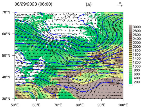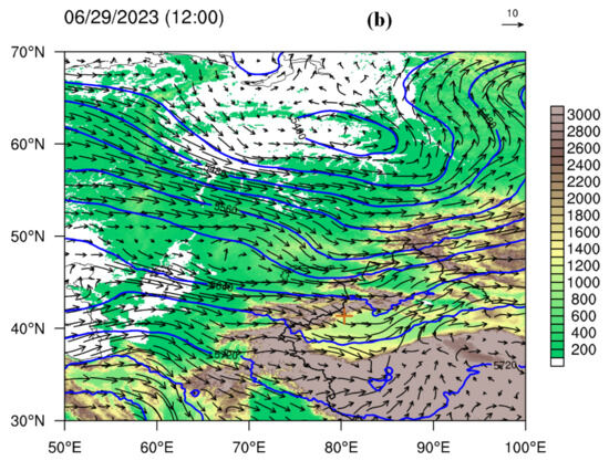 Wind field (arrows, unit: m/s) and geopotential height (blue contours, unit: gpm) at 500 hPa on 29 June 2023: (a) 06 UTC and (b) 12 UTC, with shaded terrain.