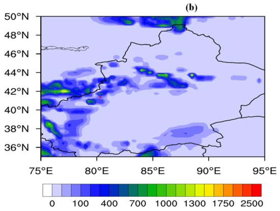 In general, information on hail frequency and intensity is difficult to obtain due to the low occurrence probability of hailstorms at a certain location. Compared to the U.S. [40], hail in Europe tends to be less frequent and severe, mainly due to a different orientation of large-scale orography (i.e., the Alps) and related circulation patterns [41,42]. The spatial extent of an area affected by hail is usually smaller than 500 km2 in central Europe. It was reported for the U.S. that 80% of a large number of observed hailstones affected areas of even less than 40 km2, and the median affected area was 20.5 km2 [43]. China is one of the countries with the most severe hail in the world [15,44]. By using hail data from 2254 surface stations in China during the period of 1980–2015, it was found that hail frequency increased with station topography height, with a maximum of more than 30 events per year in the Tibetan Plateau and a minimum of less than 1 event per year in southern China, whereas the station’s averaged maximum hail diameter decreased with topography height [15]. Xinjiang Autonomous Region, located in Northwest China, is among the areas with a high incidence of hail disasters in China. Annual hail disasters have seriously influenced health and economic development in Xinjiang. Previous studies have indicated that the occurrence frequency of local hail clouds is generally similar to that of large-scale hail clouds in Xinjiang [45]. The Aksu region, an important production area for cotton and fruit in Xinjiang, is among the areas most severely affected by hail disasters [46,47].