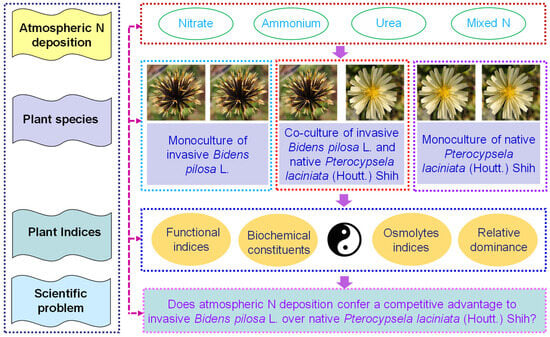 In recent years, there has been a notable increase in atmospheric N deposition, which is largely attributed to the release of N-containing compositions into the atmosphere as a consequence of the excessive combustion of fossil fuels, unreasonable and/or unsuitable production and consumption of N-containing fertilizers, and the fast expansion of animal husbandry and cultivation [,,,]. Presently, East Asia (predominantly China) has one of the three maximum rates of atmospheric N deposition globally [,,,]. In addition, other parts of the globe are also experiencing more serious atmospheric N deposition problems, such as Europe and the United States [,,,]. Nevertheless, it has been demonstrated that atmospheric N deposition may promote the invasiveness of several IPs, which in turn leads to the acceleration of the colonization of IPs by increasing the level of available N in soil [,,,]. However, atmospheric N deposition encompasses a multitude of different N components, including nitrate (NO3-N), ammonium (NH4-N), urea (CO(NH2)2-N), etc., and that the relative proportions of these N components in atmospheric N deposition may also be subject to change contingent on the alterations in energy policy and the composition of energy sources employed [,,,]. Nevertheless, atmospheric N deposition containing different N components can result in alterations in the level of available N in soil and the interactions between IPs and native plants. Such variations may result in differences in the functional differences between IPs and native plants. This could have a significant impact on the colonization of IPs. Therefore, there is a compelling rationale for investigating the effects of atmospheric N deposition containing different N components on the functional differences between IPs and native plants, with the aim of elucidating the mechanisms that facilitate the success of IPs in the context of atmospheric N deposition, particularly in the context of different N components. Nevertheless, the current state of knowledge in this field is not sufficiently detailed.