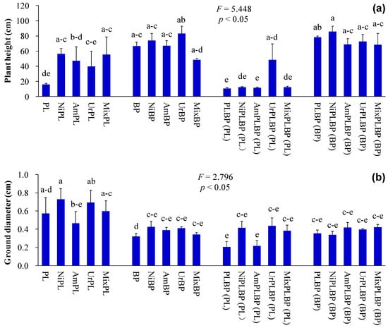 Plant height and ground diameter of B. pilosa and P. laciniata under monoculture and co-cultivation conditions, respectively ((a), plant height; (b), ground diameter). Bars (mean and standard error, n = 3) with different lowercase letters representing statistically significant differences (p ≤ 0.05). Abbreviations: PL, monocultural P. laciniata; NiPL, monocultural P. laciniata treated with nitrate; AmPL, monocultural P. laciniata treated with ammonium; UrPL, monocultural P. laciniata treated with urea; MixPL, monocultural P. laciniata treated with mixed N; BP, monocultural B. pilosa; NiBP, monocultural B. pilosa treated with nitrate; AmBP, monocultural B. pilosa treated with ammonium; UrBP, monocultural B. pilosa treated with urea; MixBP, monocultural B. pilosa treated with mixed N; PLBP(PL), co-cultivated P. laciniata; NiPLBP(PL), co-cultivated P. laciniata treated with nitrate; AmPLBP(PL), co-cultivated P. laciniata treated with ammonium; UrPLBP(PL), co-cultivated P. laciniata treated with urea; MixPLBP(PL), co-cultivated P. laciniata treated with mixed N; PLBP(BP), co-cultivated B. pilosa; NiPLBP(BP), co-cultivated B. pilosa treated with nitrate; AmPLBP(BP), co-cultivated B. pilosa treated with ammonium; UrPLBP(BP), co-cultivated B. pilosa treated with urea; Mix AmPLBP(BP), co-cultivated B. pilosa treated with mixed N.