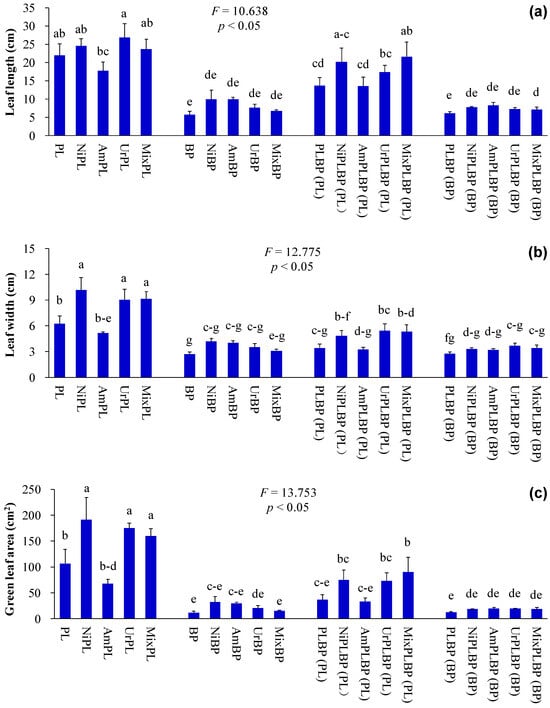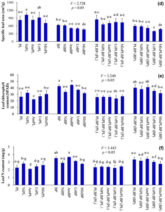 Leaf functional traits of B. pilosa and P. laciniata under monoculture and co-cultivation conditions, respectively ((a), leaf length; (b), leaf width; (c), green leaf area, (d), specific leaf area, (e), leaf chlorophyll content; (f), leaf N content). Bars (mean and standard error, n = 3) with different lowercase letters representing statistically significant differences (p ≤ 0.05). Abbreviations have the same meanings as described in Figure 2.