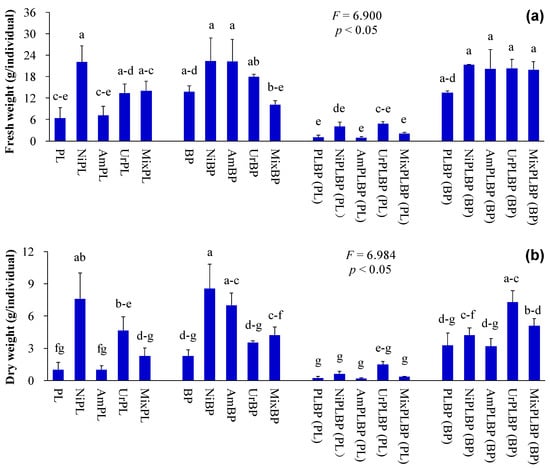 Biomass of B. pilosa and P. laciniata under monoculture and co-cultivation conditions, respectively ((a), fresh weight; (b), dry weight). Bars (mean and standard error, n = 3) with different lowercase letters representing statistically significant differences (p ≤ 0.05). Abbreviations have the same meanings as described in Figure 2.