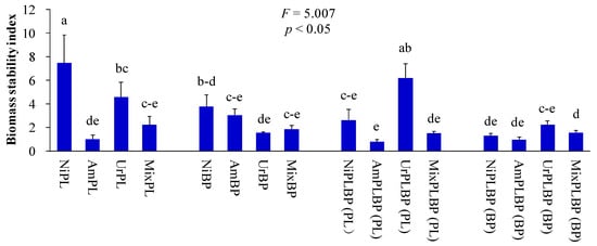 The biomass stability index of B. pilosa and P. laciniata under monoculture and co-cultivation conditions, respectively. Bars (mean and standard error, n = 3) with different lowercase letters representing statistically significant differences (p ≤ 0.05). Abbreviations have the same meanings as described in Figure 2.