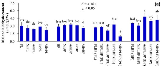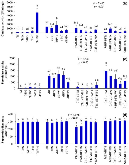 Biochemical constituents and osmolytes indices of B. pilosa and P. laciniata under monoculture and co-cultivation conditions, respectively ((a), malondialdehyde content; (b), catalase activity; (c), peroxidase activity; (d), superoxide dismutase activity). Bars (mean and standard error, n = 3) with different lowercase letters represent statistically significant differences (p ≤ 0.05). Abbreviations have the same meanings as described in Figure 2.