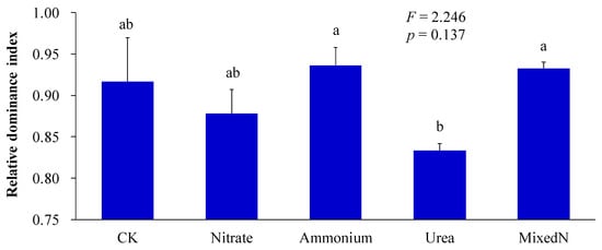 The relative dominance index of B. pilosa under co-cultivation condition. Bars (mean and standard error, n = 3) with different lowercase letters represent statistically significant differences (p ≤ 0.05). Abbreviations have the same meanings as described in Figure 2.