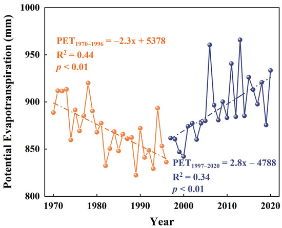 Our results indicate that annual PET tends to decrease before 1996, and then increase significantly afterward in the study area (see Figure 2). The substantial trend of abrupt change existed in many regions in China, such as the Hai River Basin [35], Jiangsu province [24], Jing-Jin-Ji region [10], Xinjiang [55], and the Wei River Basin [22], although with differences in the timing of abrupt changes.