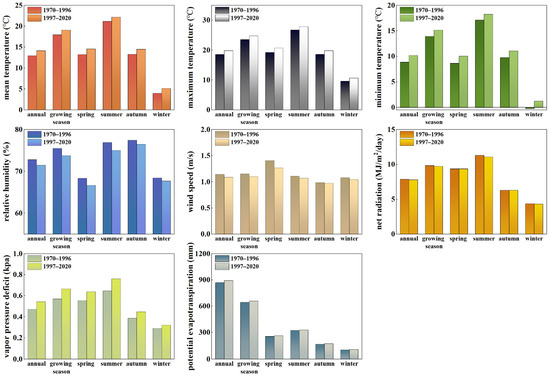 Seasonal and annual climate factor trends were separately calculated in two periods (period I: 1970–1996; and period II: 1997–2020), similar to the calculation of PET trends described in the preceding section. Averaged RH, Ws, and Rn were greater in period I than in period II at both seasonal and annual scales (see Figure 3). The other four climate factors were less in period I than in period II. Increasing Tmean, Tmax, and Tmin indicated that warming in the SC-CQ region matched the global warming trend.