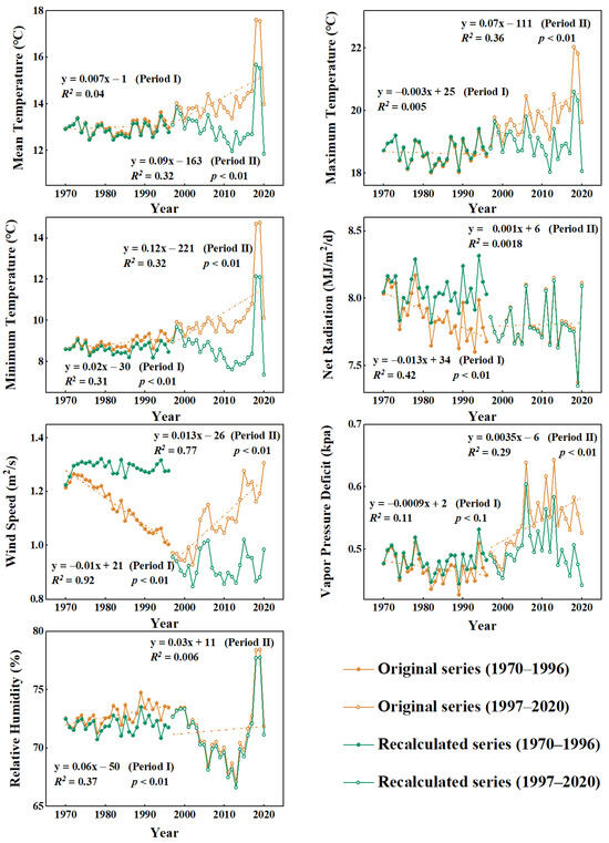Seven annual original and detrended climate variables, Tmean, Tmax, Tmin, RH, Rn, VPD, and Ws, for period I and period II were compared in this paper (see Figure 4). During period I, only the original annual RH, Tmean, and Tmin showed a positive trend, which resulted in lower values of the detrended annual RH, Tmean, and Tmin. The four other climate variables all exhibited a decreasing trend and had greater annual detrended values. There was clearly a significant difference between the original and detrended time-series data for annual Rn, Ws, and RH during period I throughout the SC-CQ region. No significant differences were found in the other four climate variables at the annual scale.