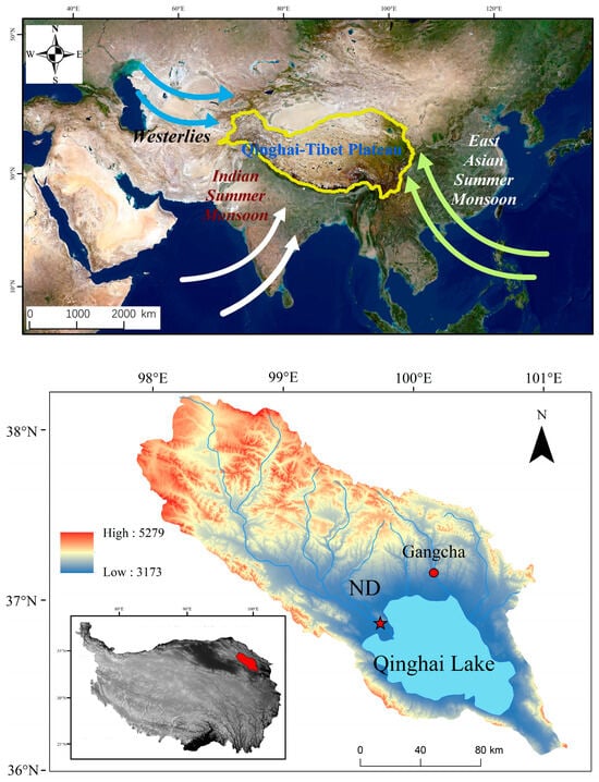 QHL (36.53–37.25° N, 99.61–100.78° E, 3198 m), nestled in the northeastern region of the QTP, holds the distinction of being the largest inland lake in China. Early to Middle Pleistocene lakes began to form in the Qinghai Basin as tectonism topographically separated it from the Yellow River drainage []. As of 2019, the water surface area of the QHL had reached 45,190.2 km2 [] (Figure 1). The climate in the QHL Basin is influenced by both the Asian monsoon (EASM and ISM) and westerly system (Figure 1). The winters are dry and cold, whereas the summers are wet and warm. The temperature in this area varies significantly with altitude, with an annual average temperature ranging from −4.5 to 4.0 °C. The average annual precipitation is 350–450 mm, with a decreasing trend from southeast to northwest []. The Gangcha meteorological station, positioned 10 km north of QHL, recorded a total precipitation of 370 mm and an average temperature of −0.6 °C between 1975 and 2011. The maximum wind speed, registered at 18 m s−1, predominantly occurs during spring []. The predominant vegetation types in the region are temperate steppes, deserts, and alpine meadows.