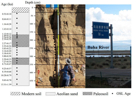 In this study, we specifically targeted the ND profile (37.04° N, 99.74° E, 3215 m) (Figure 1). The surface vegetation in this area is dominated by arid and semi-arid vegetation, including Potentilla fruticose L., Achnatherum splendens, and Stipa krylovii. With a substantial thickness of approximately 600 cm, the ND profile was located on the second terrace of the Buha River. The uppermost 30 cm of this profile consisted of modern soil enriched with plant roots. At greater depths, that is, strata at 165–240 cm and 310–350 cm, we encountered two comparatively dark, compacted, erosion-defying sandy ancient paleosols [] (Figure 2). We meticulously collected 95 bulk samples and 22 optically stimulated luminescence (OSL) samples within a height range of 0–475 cm. The OSL samples were used for age testing, whereas the bulk samples were analyzed for TOC. Additionally, we selected 53 bulk samples at intervals of 5–15 cm for δ13Corg testing.