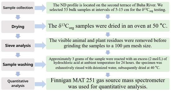 Pretreatment and test analyses of the δ13Corg sample were conducted at the Stable Isotope Laboratory at the Institute of Earth Environment, Chinese Academy of Sciences. The organic carbon samples were dried in an oven at 50 °C, and visible animal and plant residues were removed before grinding the samples to a 100 μm mesh size. To eliminate carbonates, approximately 3 g of the sample was reacted with excess (2 mol/L) hydrochloric acid at ambient temperature for one day. To achieve neutrality, the specimen was exhaustively rinsed with deionized water, subsequently dried at 40 °C, and further pulverized. The desiccated samples were incinerated within vacuum-sealed quartz tubes at 850 °C for a duration of 4 h, with 1 g each of CuO, Cu, and Pt foil. The resultant carbon dioxide was isolated via cryogenic purification. The isotopic ratios of the purified CO2 were quantified using a Finnigan MAT 251 gas source mass spectrometer. These isotopic ratios are documented in δ-notation and articulated as per mil (‰) variances relative to the V-PDB benchmark for carbon []. Replicate analyses of the 53 samples showed an average standard deviation of 0.2‰. The experimental procedure is shown in Figure 3.