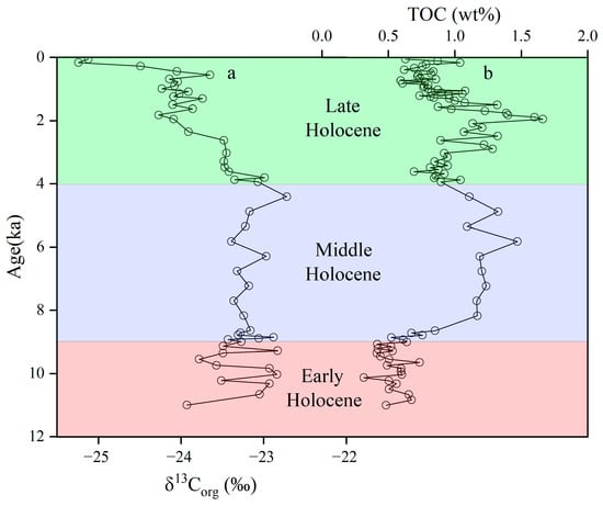 Research has shown that TOC around the QHL undergoes little degradation in arid and cold climates [,]. The TOC values of the ND profile spanned from 0.32 to 1.66 wt%, whereas that of the ZYC profile range from 0.12 to 3.19 wt% []. TOC values were lower in the Early Holocene and higher in the Late Holocene. During the Early Holocene, the TOC values were low, whereas they were considerably elevated during the Middle and Late Holocene. However, the TOC values in lacustrine sediments of the QHL are higher than that in terrestrial sediments, ranging from 0.4 to 9.0 wt%. Its trend was higher at 10.5–4 ka, and its content decreased after 4 ka []. The TOC values of the Genggahai Lake sediments were significantly higher than those of the terrestrial sediments [] (Figure 5B). The TOC content and its variations in the terrestrial aeolian and lacustrine sediments indicate that the organic matter sources of the sediments from Genggahai and QHL were not primarily derived from terrestrial ecosystems during the Holocene. In the Early Holocene, the lake water level was low [], the summer monsoon was enhanced, the summer sunshine duration was long [,], and the algae (mainly Cladophora) in the lake increased. In the Middle and Late Holocene, the water level was several meters higher than it is now [], and algae (mainly Cladophora) became the dominant contributor to lacustrine organic matter [], resulting in more negative δ13Corg values in lacustrine sediments. Therefore, the organic matter in the lacustrine sediments of the QHL may have been derived from aquatic organisms.
