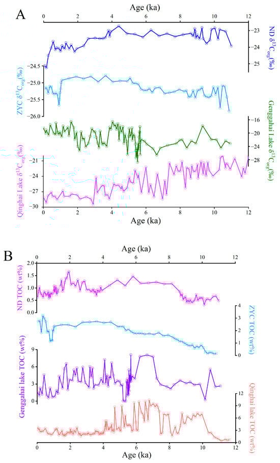 The δ13Corg values of the ND profile spanned from −25.24‰ to −22.72‰, exhibiting a fluctuation amplitude of 2.52‰. The Zhongyangchang (ZYC) aeolian profile is located at the southeastern margin of the QHL []. This profile is similar to the ND profile and can be divided stratigraphically from top to bottom into modern soil, loess containing a paleosol, and aeolian sand. The δ13Corg values range from −25.8‰ to −24.8‰, with an amplitude of 1‰ []. The δ13Corg values of the two profiles had a small change. However, the variation range of the δ13Corg in the sediment of QHL is between −30‰ and −20‰, with an amplitude of 10‰ []. The aquatic plants are primarily dominated by Cladophora in modern QHL, and the δ13Corg values ranged from −33.6‰ to −28.6‰ []. Genggahai Lake is a diminutive and superficial aquatic entity located in the Gonghe Basin in the northeastern QTP. The oscillation magnitude of δ13Corg within the lacustrine sediment was approximately 12‰ [] (Figure 5A). The δ13Corg values of terrestrial ecosystems have changed slightly, whereas those of lacustrine ecosystems have significantly changed during the Holocene. Studies of the δ13Corg, δ15Ntot, and atomic Corg/Ntot ratio of sediments from Lake Ximencuo in the eastern QTP show that the bulk organic matter in these lake sediments originates from a mixed source comprising autochthonous algae and aquatic and terrestrial plant inputs []. As inferred from the preceding analysis, irrespective of the lacustrine spatial extent, the content and variation of the δ13Corg diverge from terrestrial ecosystem deposits. Terrestrial ecosystems were not the principal contributors to lacustrine organic matter during the Holocene.