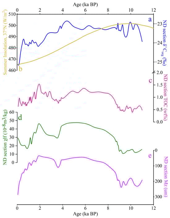 Comparison of the δ13Corg in the ND profile of QHL with other indicators since the Holocene. (a) The δ13Corg of the ND profile, (b) the Northern Hemisphere summer insolation at 37° N [], (c) the TOC, (d) low-frequency magnetic susceptibility (χlf), and (e) median grain size (Mz) of the ND profile. (d,e) Have been published in detail in the literature [].