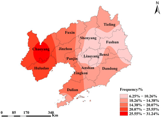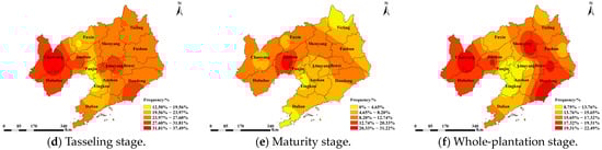 - We revealed the temporal characteristics of CDHEs over the maize reproductive period. From 2005 to 2020, only 2012 did not have a CDHE. The ratios of CDHEs in 2009 and 2014 were the largest, at 46.43% and 51.79%, respectively. CDHEs occurred most frequently during the twelfth leaf stage, with a significant increasing trend. The second-highest number of CDHEs occurred during the tasseling stage. The spatial distribution characteristics were as follows: The frequency of CDHEs in central Liaoning Province was low. Western Liaoning Province was generally prone to CDHEs.
