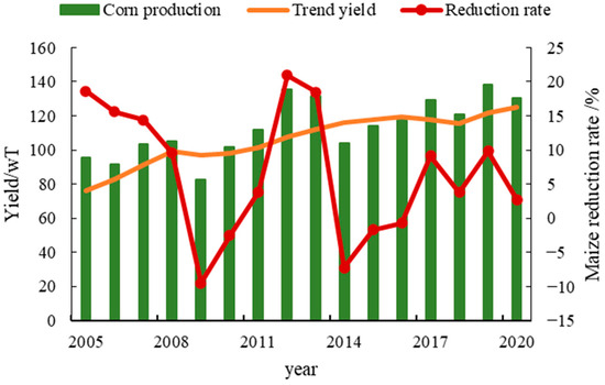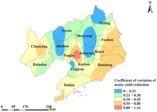 - The areas with high coefficients of variation for maize yield reduction were mainly located in eastern Liaoning Province, with several concentrated in central and western Liaoning Province. There were differences in the spatial distribution of the YLRI and the coefficient of variation of maize yield reduction, with the high-value areas in western and southern Liaoning Province.