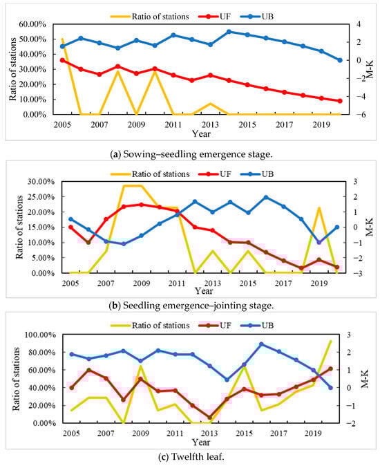 Figure 2e shows that the station ratio of CDHEs during the maturity stage had an increasing trend, with no stations experiencing CDHEs before 2010. In 2011, 50% of the stations experienced CDHEs. The UF and UB curves intersected in 2019, indicating that the compound dry–hot station ratio mutated that year. The UF value showed an upward trend after the mutation in 2019, indicating that the compound dry–hot station ratio had an upward trend thereafter.