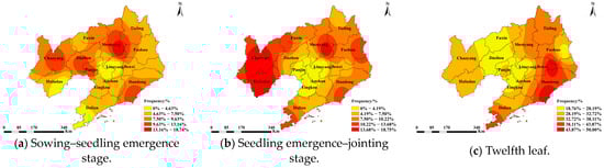 Figure 3b shows that the frequency of CDHEs occurring in the seedling emergence–jointing stage had a spatial distribution of low in the middle and high in the surroundings, with the maximum value occurring in Shenyang City and Huludao City, where CDHEs occurred three times in total. No CDHEs occurred in Anshan City, Liaoyang City, Panjin City, or Yingkou City during this period.