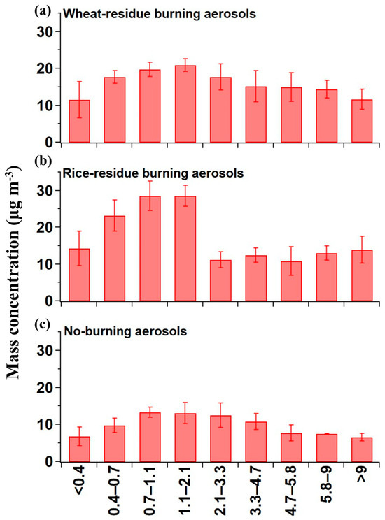 Mass–size distribution of the (a) wheat-residue burning, (b) rice-residue burning, and (c) no-burning aerosols.