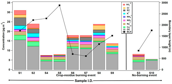 Mass concentration of elemental carbon (EC), organic carbon (OC), and some major water-soluble inorganic ions (WSIs) (µg m−3) determined in ambient aerosol particles during crop-residue burning and no-burning events in Patiala, Punjab. Boundary layer height (m agl) during the aerosol sampling days is also depicted (see Table 1 for sampling details).