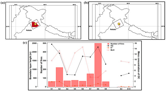 Figure 3a,b show the number of fire hotspots during crop-residue burning and the no-burning period respectively, at Patiala, for all samples. For the aerosol sampling days, the fire count data are obtained from Fire Information for Resource Management System (FIRMS). With the view of evaluating the influence of crop-residue burning activities on the chemical composition of aerosols, we have evaluated the correlation between the number of fire spots at the sampling site and the mass concentration of OC (r = 0.59, n = 10) and K+ (r = 0.45, n = 10), the important chemical tracers of biomass burning, in PM0.4 samples (Figure 3c). The calculated correlation value between the number of fires and OC becomes more significant/positive (in magnitude) if we exclude the deviation observed in the datasets in sample S1 (i.e., r = 0.79, n = 9). One of the potential reasons for the relatively high OC concentration (16 µg m−3) with respect to the lower number of fire counts (around 62) in the S1 sample, is the lower boundary height (1500 m agl) during 17–20 April 2009. To summarize, a moderate positive correlation between the number of fires and OC and K+, as well as enhanced OC and total WSI during the burning events, confirm that in Patiala, crop-residue burning contributes substantially to the carbonaceous aerosols.