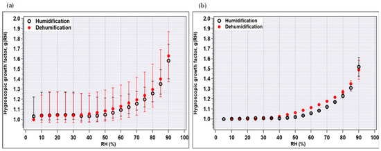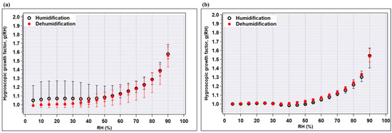 Hygroscopic growth factors of (a) crop-residue burning, and (b) no-burning samples as a function of RH for the humidification and dehumidification modes. The minimum and maximum values are indicated by bars and the average values by circles.