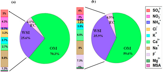 Chemical compositions of ultrafine PM0.4 from (a) rice-residue burning, and (b) wheat-residue burning aerosols (OM, organic matter = OC × 1.6).